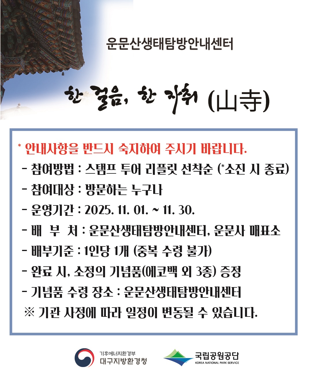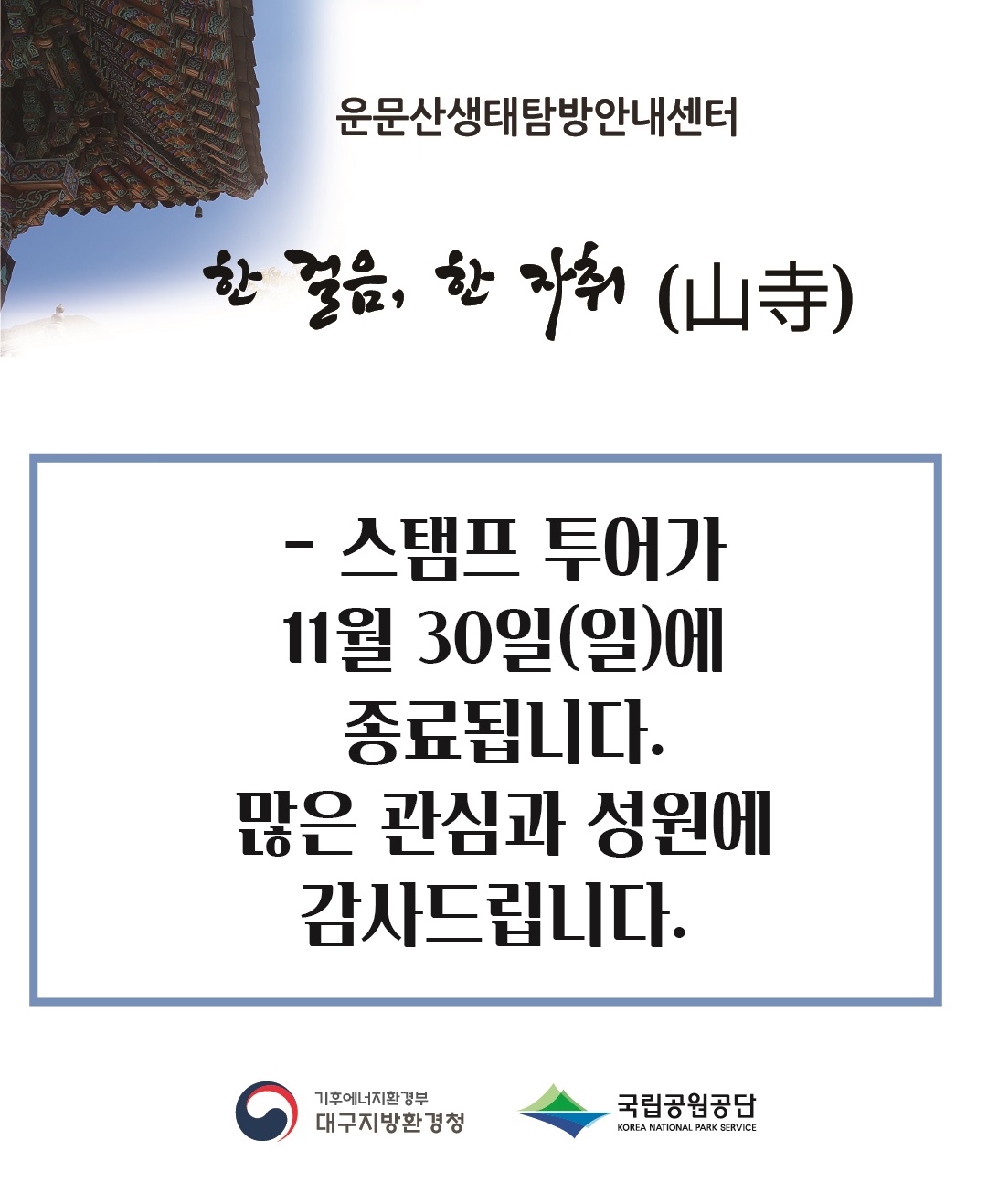 | 50 | 스탬프 투어 한 걸음, 한 자취(山寺)가 11월 1일부터 시작됩니다. | 박수진 | 2025.10.30 | 250 | ![]() |