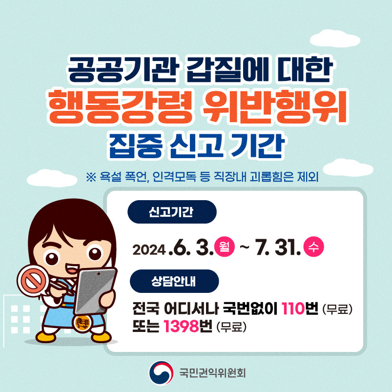 | 23 | 공공기관 갑질행위 집중신고기간 알림 | 박수진 | 2024.06.12 | 723 | ![]() ![]() |