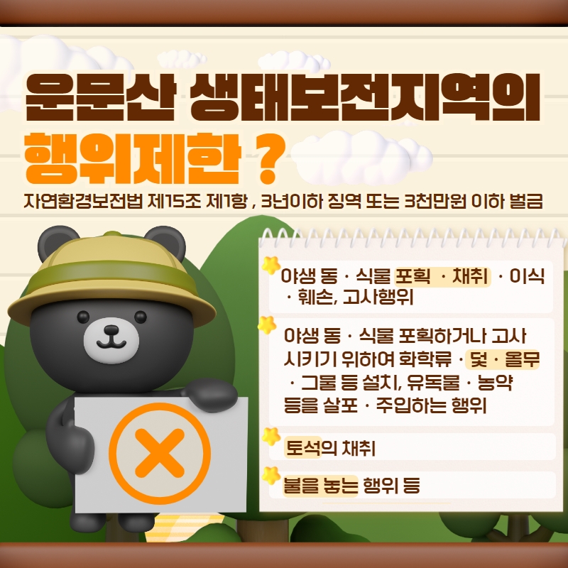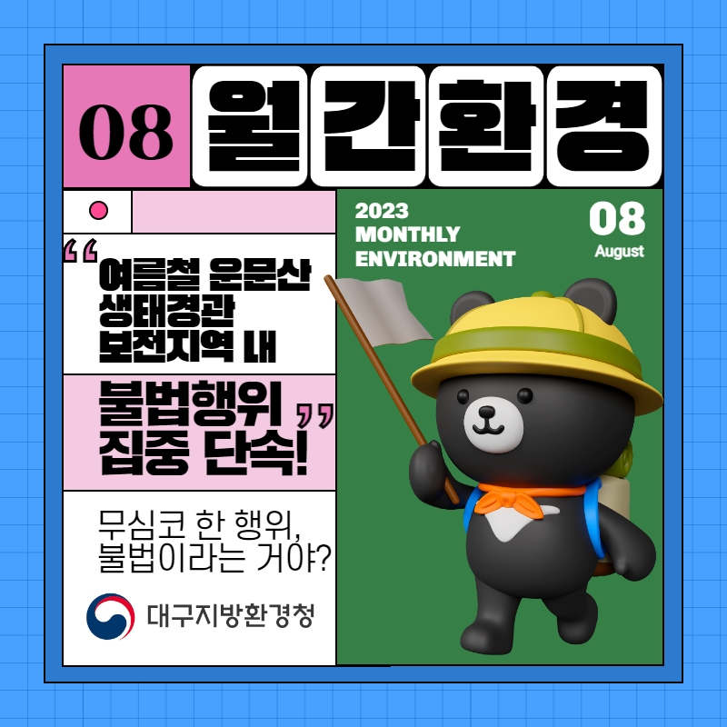| 16 | 여름 휴가철 운문산 생태경관보전지역 내 불법행위 합동점검 실시 알림 | 관리자 | 2023.08.04 | 957 | ![]() ![]() ![]() ![]() ![]() ![]() |