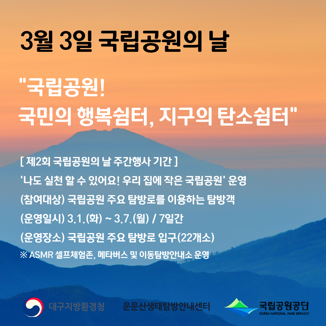 | 3 | 제2회 3월 3일 국립공원의 날 | 관리자 | 2022.02.26 | 1026 | ![]() |