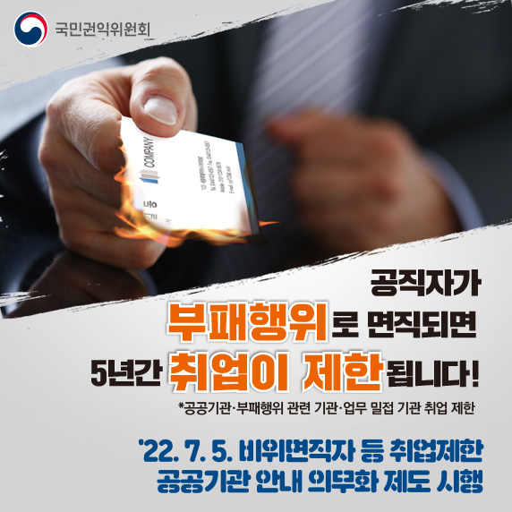 | 4 | 2022.7.5 부터 비위면직자 등 취업제한 공공기관 안내 의무화 제도 시행 | 관리자 | 2022.07.14 | 978 | ![]() |